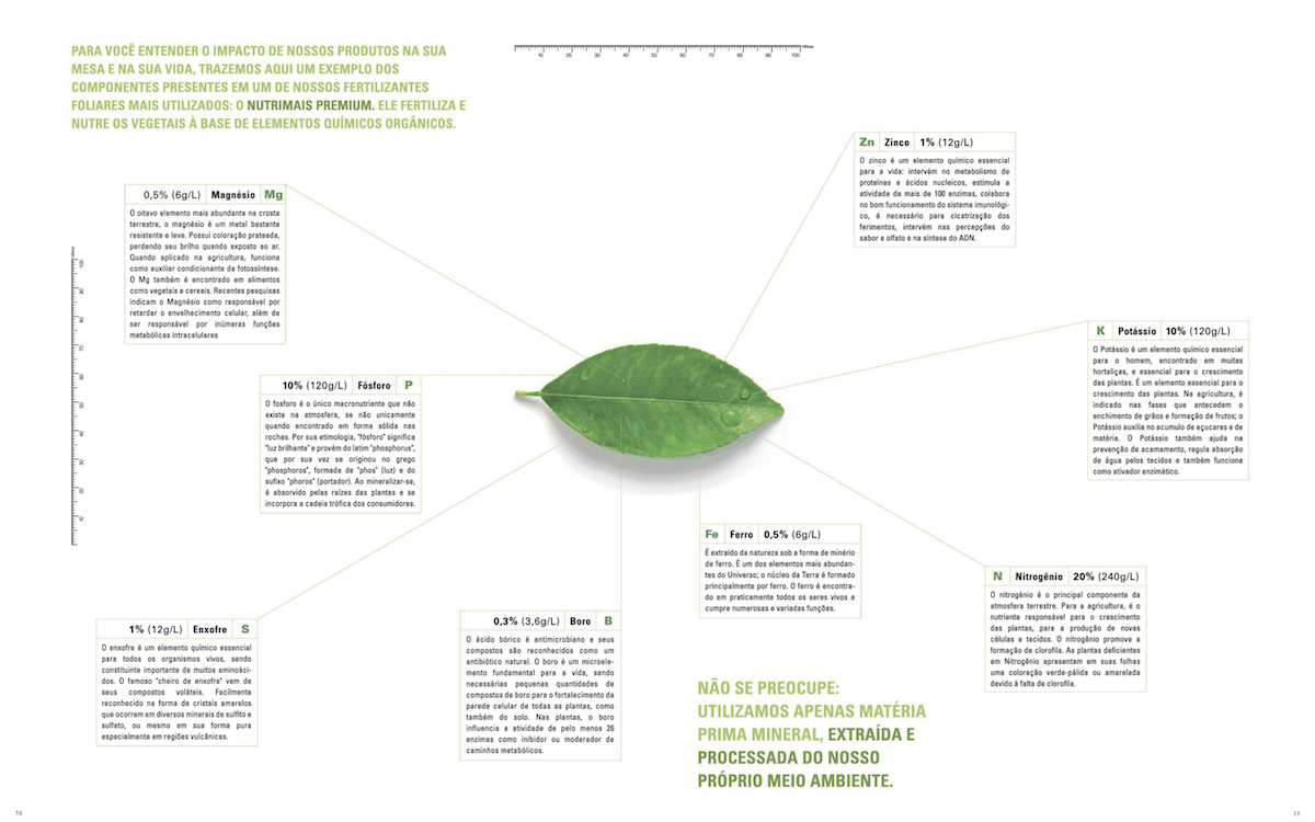 Para mostrar a quantia de cada um dos elementos do fertilizante foliar NutriMais Premium da Agroserv, imitamos a forma como o produto é pulverizado nas plantações. Com uma seringa, criamos diferentes tamanhos de gotas, com tamanhos proporcionais a cada um dos elementos de sua composição, finalizando a peça digitalmente.