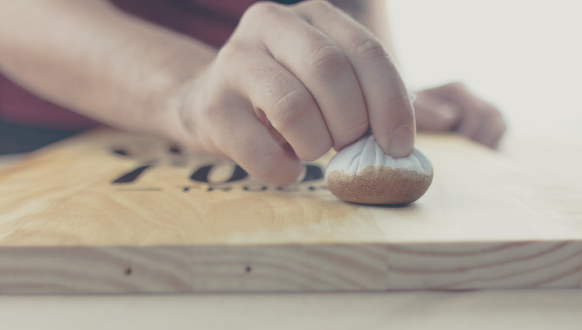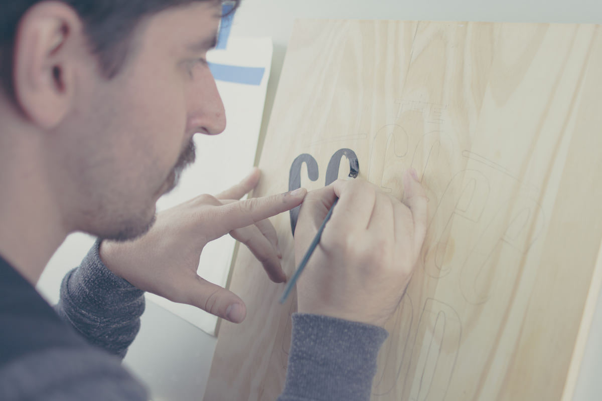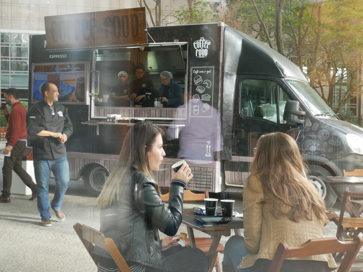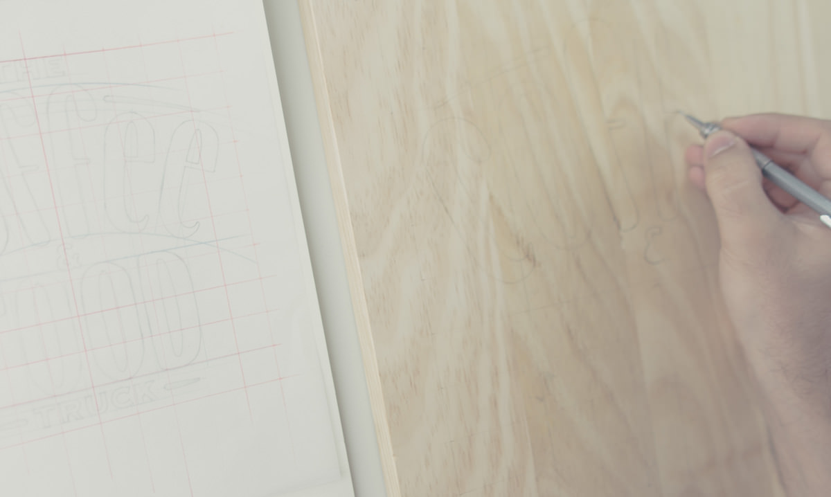 Para a Nestlé, desenvolvemos a marca The Coffee & Food Truck: Começamos os estudos no papel e, quando chegamos no resultado desejado, criamos a marca diretamente na madeira com técnica de sign painting, dando acabamento utilizando Nescafé como verniz - digitalizamos este resultado com todos seus ruídos e nuances e utilizamos esta versão no Food Truck e em todos seus materiais.